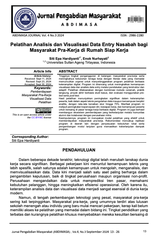 Tingginya tingkat pengangguran di kalangan masyarakat pra-kerja serta meningkatnya kebutuhan tenaga kerja dengan literasi data yang memadai memunculkan urgensi untuk menyelenggarakan program pelatihan berbasis keterampilan digital. Program ini dirancang untuk meningkatkan kemampuan visualisasi data dan analisis data entry melalui pendekatan yang terstruktur dan adaptif. Pelatihan dilaksanakan dengan kombinasi metode ceramah, praktik langsung, proyek akhir berbasis studi kasus, dan evaluasi menggunakan pre-test serta post-test.
