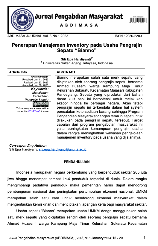 Bianno merupakan salah satu merk sepatu yang diciptakan oleh seorang pengrajin sepatu bernama Ahmad Huzaemi warga Kampung Maja Timur Kelurahan Sukaratu Kecamatan Majasari Kabupaten Pandeglang. Sepatu yang diproduksi dari bahan dasar kulit sapi ini berpotensi untuk melakukan ekspor hingga ke berbagai negara. Akan tetapi pengrajin sepatu ini terkendala dalam hal system pencatatan ketersediaan barang sehingga Program Pengabdian Masyarakat dengan tema ini tepat untuk dilakukan pada pengrajin sepatu tersebut. Target capaian dari program pengabdian masyarakat ini yaitu peningkatan kemampuan pengrajin usaha dalam rangka meningkatkan wawasan pengelolaan manajemen inventory pada usaha yang dijalaninya.