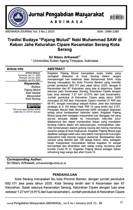 Kegiatan Pajang Mulud merupakan suatu tradisi yang seringkali dilakukan di Kota Serang dalam rangka memperingati hari kelahiran Nabi Muhammad SAW. Kota Serang merupakan Ibu Kota Provinsi Banten yang memiliki jumlah penduduk 692.101 jiwa pada tahun 2020, dengan 6 Kecamatan dan 67 Kelurahan yang ada di dalamnya. Salah satunya yaitu Kecamatan Serang, Kelurahan Cipare dengan luas area sebesar 1.27 km² (4.91% dari luas kecamatan). Jumlah penduduk di Kelurahan Cipare pada tahun 2020 mencapai 25.342 jiwa. Kelurahan Cipare memiliki 21 RW dan 89 RT, dengan mencakup wilayah Kebon Jahe dan berlokasi strategis di Jl. KH Abdul Hadi. RW 14 yang terdiri dari 5 RT. Perayaan Maulid Nabi Muhammad SAW seringkali dilakukan setiap tahun berdasarkan kalender Islam. Kegiatan Pajang Mulud yang oleh sebagian masyarakat luar dianggap hal yang sia-sia ternyata dibalik itu menyimpan nilai-nilai luhur didalamnya dan dapat memberikan kesan yang mendalam tentang makna dalam arti kebersamaan, meningkatkan nilai-nilai kemanusiaan seperti gotong royong dan tolong menolong sesama warga di area lingkupnya. Kegiatan Pajang Mulud juga dijadikan sebagai salah satu cara dalam mempererat hubungan silaturahmi baik internal maupun eksternal. Berdasarkan data sampel yang diambil dari 100 warga Kebon Jahe, sebagian besar masyarakat menyatakan bahwa kegiatan ini sangat bermanfaat dan dinantikan oleh setiap orang, terutama saat kondisi Covid-19 ini. Kegiatan Pajang Mulud sebagai bahan refreshing bagi warga dari efek Covid-19.